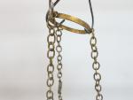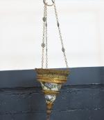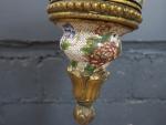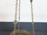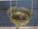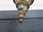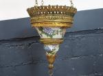 Suspension en laiton repoussé et émaux cloisonnés polychromes à décor floral, chainettes ornées de rosaces émaillées. Haut. du corps : 38 cm - Haut. totale : 100 cm - Diam : 31 cm - 46
