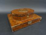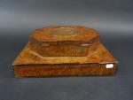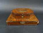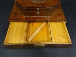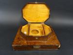 Coffret à jeux à deux niveaux en placage de ronce, la partie supérieure en retrait à pans coupés et ornée sur le couvercle d'un médaillon d'après Pigalle des profils de Rois de France, la partie inférieure ouvrant par un tiroir compartimenté. Larg.: 37cm, Prof.: 29cm, Haut.: 14cm (quelques manques)
