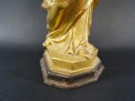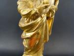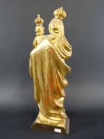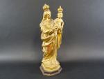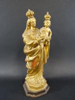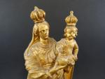 Statuette d'époque XVIII's représentant la Vierge à l'Enfant couronnée en bois sculpté et doré. Haut : 37 cm (petits manques et usures à la dorure)