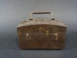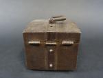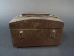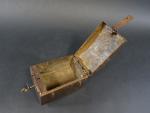Coffret de messager en fer forgé, le corps cerclé d'une frette et à quatre passants latéraux, le couvercle bombé à poignée mobile rectangulaire avec sa clé et sa serrure à moraillon, ép. XVII's. Long : 15 cm - Haut : 10 cm - Prof : 10 cm