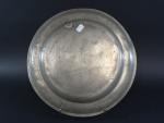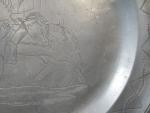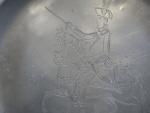Plat rond en étain gravé d'un cavalier de l'Empire, aile à frise d'entrelacs, ép. XIX's. Diam : 36 cm (anneau de suspension, soudé au revers)