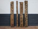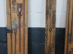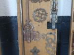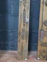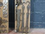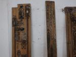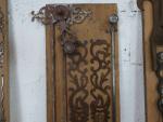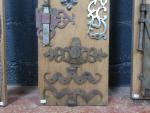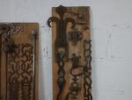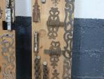 Ensemble de quincaillerie et serrurerie en fer forgé : targettes, pentures, heurtoirs, entrées de serrures, crémones, etc..., montés sur quatre planches