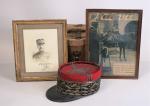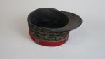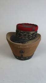 Souvenir du Maréchal FOCH. Képi de Maréchal de France, en drap écarlate. Large bandeau en drap noir, brodé de trois rangées de feuilles de chêne et galons dorés. Visière en cuir. Coiffe intérieure en cuir et toile noire. (traces d'humidité, petites usures) Dans une boite à chapeau recouvert de toile, renforcé de cuir, doublé de papier à rayures bleues. (accidents)