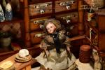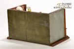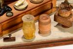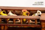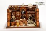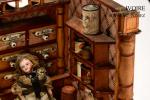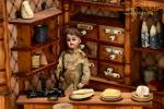 Epicerie 19ème France, Demi colonnes en façade, elle est composée de nombreux accessoires (comptoir, poêle, boites diverses, etc..),tous les tiroirs sont dénommés sur plaque de porcelaine (cacao, nouilles, pois, chocolat, lentilles, riz, farine, etc.)