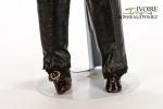 BRU (attribué à), France 19ème, poupée tête en biscuit pivotante sur collerette en biscuit, marquée en creux au sommet de la tête (illisible), yeux bleus clairs, corps raide en cuir, superbe costume de cosaque, chemise de coton et broderie, toque en fourrure, fusil en bandoulière (métal doré) avec sa gibecière, pantalon avec haut de bottes en cuirs et bottines à talons.