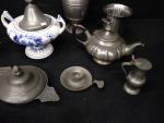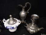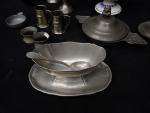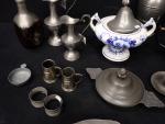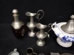 Lot comprenant : GUY DEGRENNE, un sceau à glaçons en métal (dim 14x14 cm) ; un bougeoir à main en étain marqué au revers "titre légal" (dim : 5x16 cm) : une saucière sur plateau adhérent en étain marqué au revers "étain d'art titre légal Made in France" (dim : 8x22 cm) ; EDOUARD HUECK une théière en étain le manche en bois marqué au revers (dim : 17x28 cm) ; une petit pichet en étain marqué au revers (dim : 15x9 cm) ; une cassolette en étain marquée au revers (dim : 12x28 cm) ; une aiguière en étain marquée au revers "Les étains de France, Made in France" (dim : 34x22 cm) ; deux ronds de serviette, une paire d'aiguière en étain marquées au revers (dim : 23x14 cm et 19x12 cm) ; un taste vin en étain, deux petites chopes en métal à décor de couronnes etc (usures)