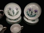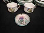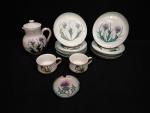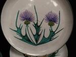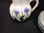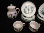 Etienne DANIEL à VALLAURIS - Partie de service de table (13 pièces) en céramique émaillée à décor de chardons sur fond gris perle comprenant : un pichet couvert, 9 assiettes plates, 1 cendrier, 2 bols, le tout marqué au revers (usures)