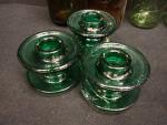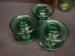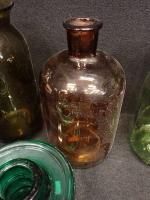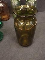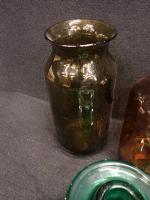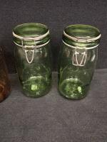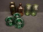 VERRERIE - Lot comprenant : bocaux "l'idéales" , deux anciens pots à pharmacie sans leurs bouchons ( H26 et 24cm) et trois partie de ligne à haute tension en verre tinté vert (H10 D14cm) l'une d'elle avec éclats et fels