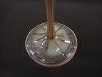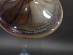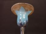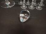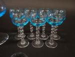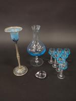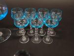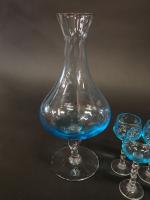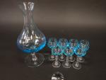 ART DE LA TABLE - VERRERIE - Partie de service à liqueur en verre tinté bleu comprenant : Une carafe piédouche (H25cm), 7 Petits verres à pied (H10cm), on y joint un presse papier en forme de goutte (6*5cm) et un bougeoir en verre tinté formant une tulipe marqué à la base (H26cm)
