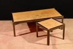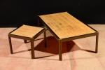 Deux tables basses années 1970, montures laiton, les plateaux en verre à l'imitation du marbre. 36 x 121 x 64 cm pour la plus grande. H. 36 cm. Larg. 45 x 45 cm