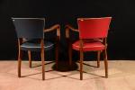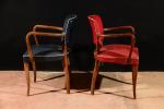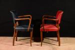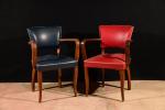 Deux fauteuils bridge de bureaux, garnitures de cuir rouge et bleu.