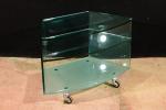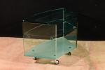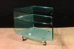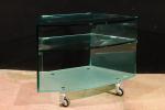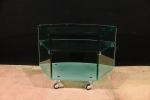 Meuble de télévision en verre, sur roulette à trois plateaux. H. 63 cm. Larg. 90 cm. Prof. 51 cm