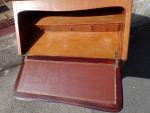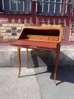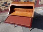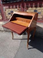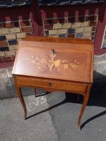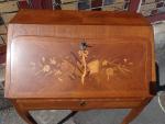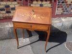 Bureau de pente de style Louis XV en bois naturel et marqueterie d'instruments de musique ouvrant par un tiroir en ceinture et un abattant. Dim : 95x70x43 cm (usures)