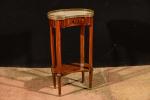 Table de salon de style Louis XVI, le plateau de forme haricot en bois de placage, plateau de marbre blanc à galerie de laiton. H. 73 cm. Larg. 41 cm