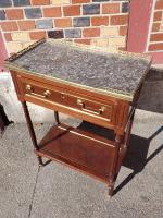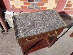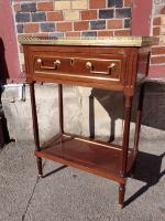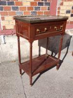 Petite console étroite de style Louis XVI, d'époque XIXème en acajou sur quatre pieds cannelés ouvrant par un tiroir en ceinture et plateau de marbre gris. Dim : 84x58x30 cm (usures)