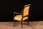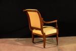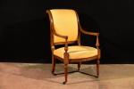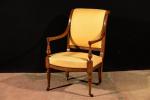 Fauteuil d'époque Directoire à dossier renversé, accotoirs à balustres, garniture de soie jaune, sur roulettes.