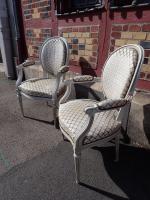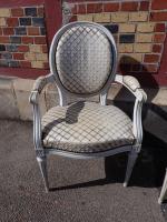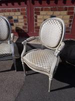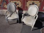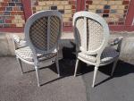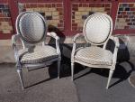 Paire de fauteuils de style Louis XVI en bois mouluré laqué gris à dossier médaillon en bois laqué. Dim : haut 96 cm, l 60 cm (usures, tâches).