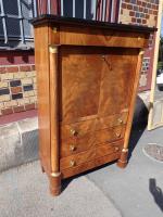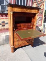 Secrétaire d'époque empire en acajou ouvrant par un abattant et trois tiroirs, les montants à demi colonnes bagués de bronze, bel intérieur à casier et tiroir secret. dim : 145x96x40 cm (usures)