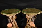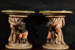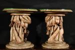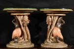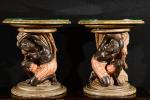 Paire de guéridons bas en bois sculpté polychrome à décor de Maures accroupis avec des draperies.