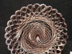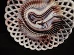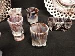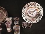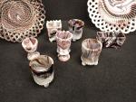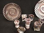 Dans le goût de PORTIEUX. Deux assiettes ajourées et sept coquetiers ou petits vases miniatures en verre opalin pressé moulé à effet marbré ou jaspé teinté violet et blanc. Diam. 26 cm. H. moyenne : 6 cm