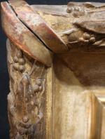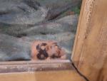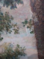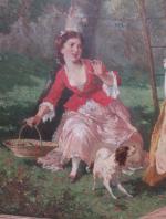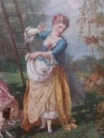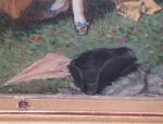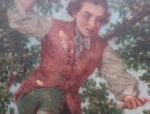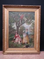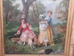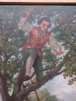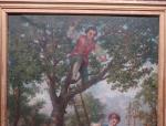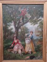 CHAPUIS Honoré (né en 1817): La cueillette des cerises, huile sur toile signée et datée 1874. Dim.: 108 x 78 cm (usures). Portant une étiquette au dos difficilement lisible : "... de Jean Jacques Rousseau..."