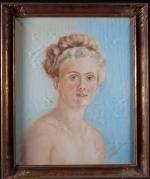 De RAZONMIKINE C. (XX's) : Portrait de jeune femme blonde. Pastel signé et daté 1939 encadré sous verre, Dim : 63 x 50 cm (usures)