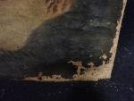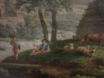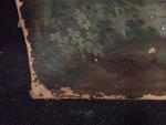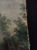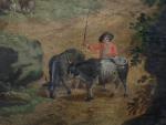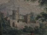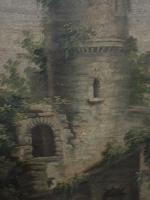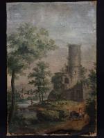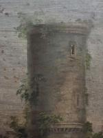 Ecole du début du XIX ème siècle. Scène animée à la tour. Dimensions : 77 x 52 cm (manques)