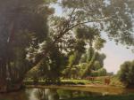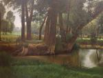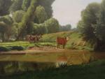 Ecole du XIX's. Deux vaches au bord d'un étang dans un paysage. Huile sur toile. Dim.: 47 x 68 cm