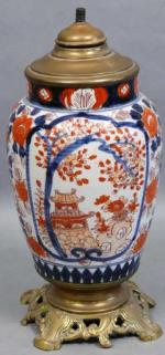12 - Pied de lampe en porcelaine Imari de paysage avec temple, en réserve sur fond floral, monture bronze, ép. XIX'. Haut. : 30 cm