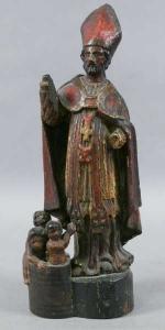 21 - Saint-Nicolas en bois sculpté polychrome, ép. XVII's (accidents et manques). Haut : 41 cm