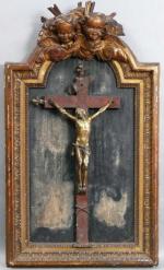 31 - Christ en croix en bronze d'époque XVIII'. Haut. : tête-pieds : 23 cm, dans un cadre en bois doré et sculpté de deux têtes d'angelots dans les nuées d'époque XVIII's. Haut. : 73 cm