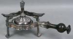 40 - Réchaud tripode en métal argenté de forme mouvementée, anses en bois tourné, style XVIII' s.
