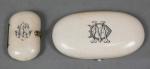 41 - Etui à couture en ivoire chiffré MD avec accessoires dont étui à aiguilles en vermeil (manques et éléments remplacés) Long. : 11 cm, et petit porte-monnaie en ivoire chiffré. Long. : 6 cm, ép. Napoléon III