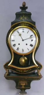 43 - Cartel Neuchâtelois de forme violonnée et son socle en bois peint à décor d'une coupe fleurie et de semi floral sur fond noir, cadran émaillé, ép. début XIX' s. Haut. : 79 cm
