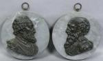64 - Henri IV et Sully : Paire de bustes de profil en bas-relief en fonte, sur médaillon en marbre bleu turquin, ép. XIX'. Diam. : 20 cm