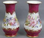 76 - Paire de vases balustres en porcelaine à décor d'une frise florale polychrome dans un encadrement doré, sur fond rose, époque Napoléon III. Haut. : 30 cm