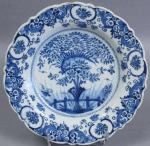 77 - DELFT : Assiette en faïence à décor en camaïeu bleu d'un arbuste fleuri devant une haie, marqué à la ''hache de porcelaine'', ép. XVIII' s. Diam. : 22,5 cm