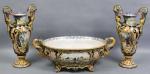 84 - NEVERS-MONTAGNON : Garniture comprenant une jardinière ovale et une paire de vases balustres à corps violonné en faïence polychrome à décor double face en réserve symbolisant les quatre saisons et des amours jouant, anses dragons, marqués. Haut. des vases : 39 cm - Long. de la jardinière : 52 cm (petites égrenures)