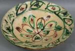 88 - ART POPULAIRE : Coupe en terre cuite vernissée à décor stylisé vert et manganèse, travail populaire, ép. XIX' s; Diam. : 30,5 cm