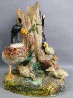 Delphin MASSIER (1836-1907) à Vallauris : Canards et canetons s'abreuvant près d'une souche. Important groupe formant bouquetière en barbotine et faïence émaillée polychrome, les animaux traités en ronde-bosse, vers 1900, signé et situé sous la base. 53 x 49 x 27 cm.