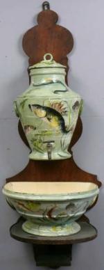 104 - MONTIGNY S/LOING - Georges DELVAUX (1834-1909) - Charles-VIRION (1865-1946) : Fontaine couverte et son bassin en faïence à décor peint de poissons dans le milieu aquatique, signés Montigny s/ Loing et Dx, la fontaine signée Virion. Bassin : Haut. : 16 cm - Larg. : 36 cm. Fontaine couverte : Haut. totale 38 cm (fêlure au bassin, manque et réparation à la fontaine)