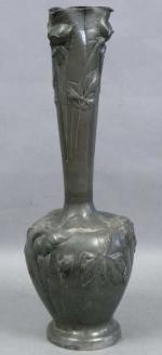106 - P. CHAUMETTE : Vase soliflore en étain à décor floral en relief, col trilobé, signé, vers 1900. Haut. : 45 cm (petite soudure au pied)