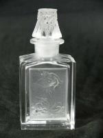 LALIQUE-COTY : ''L'Effleurt''. Flacon en verre blanc soufflé-moulé patiné, avec son bouchon moulé-pressé patiné, marqué et signé en relief. Deuxième version, à partir de 1912. Haut. : 11 cm. Bibliog. : F. MARCILHAC ''R. LALIQUE, catalogue raisonné de l'oeuvre en verre''. Edition de l'Amateur, p.925
