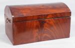 16 - Coffret à couvercle bombé en placage d'acajou, petites poignées latérales en laiton, ép. Restauration. Long. : 41 cm - Prof. : 26,5 cm - Haut. : 23,5 cm (petits accidents au placage)